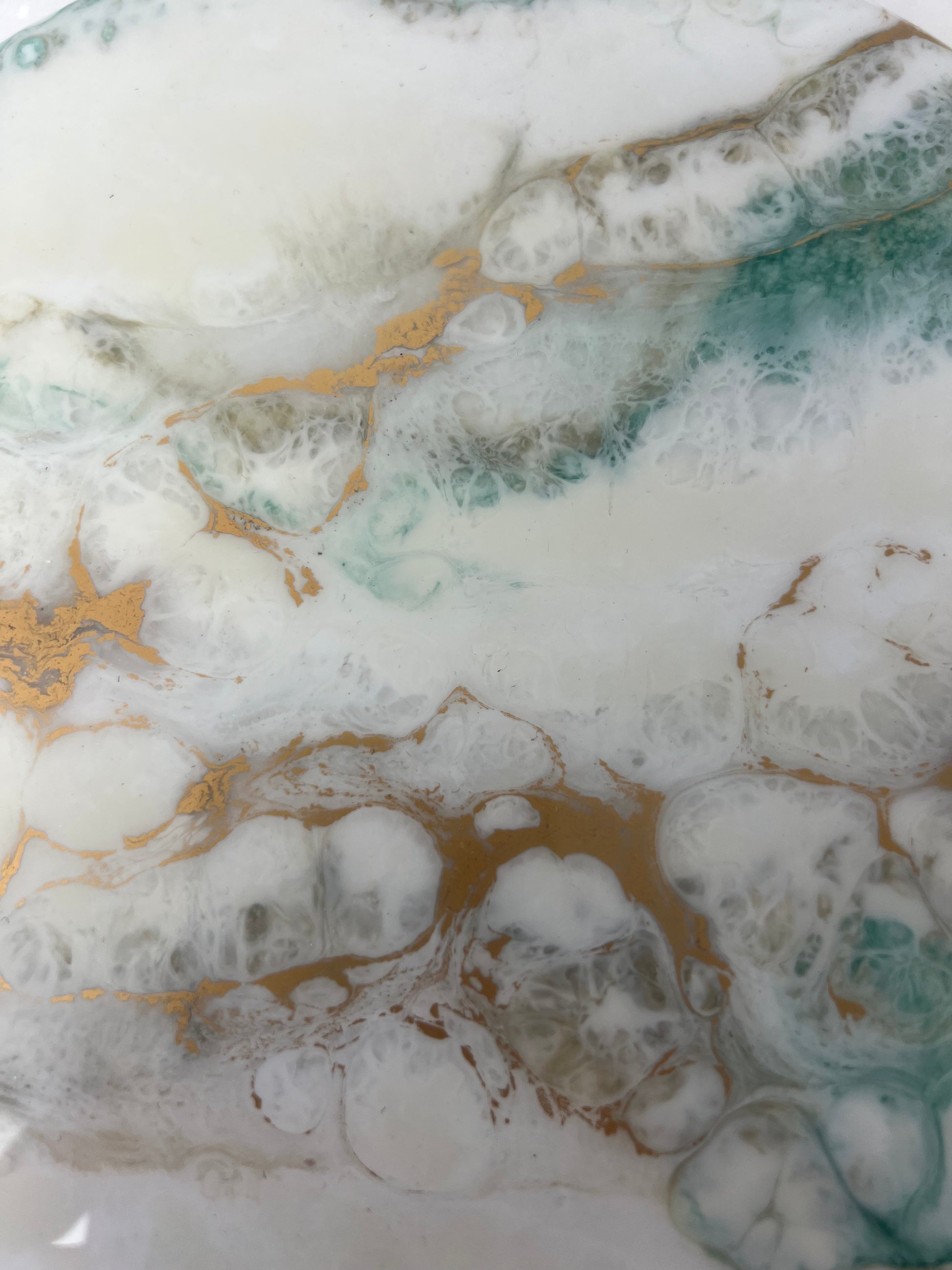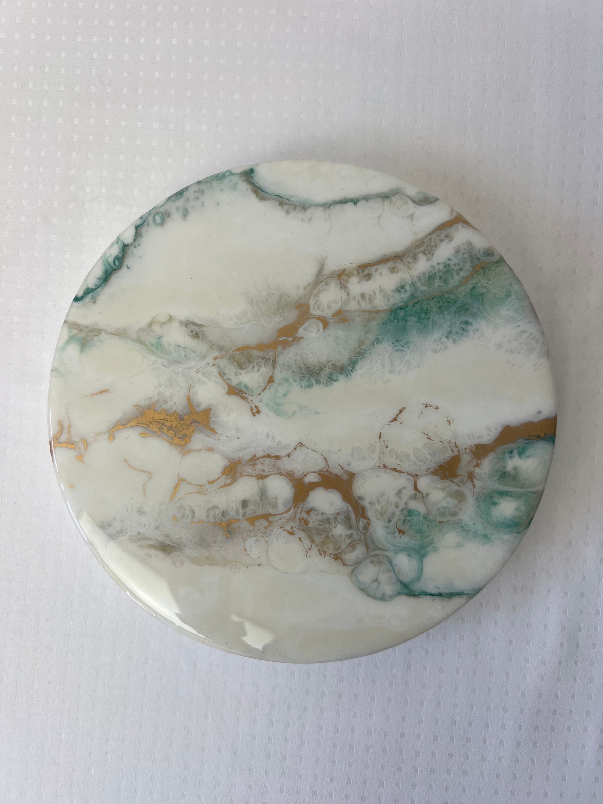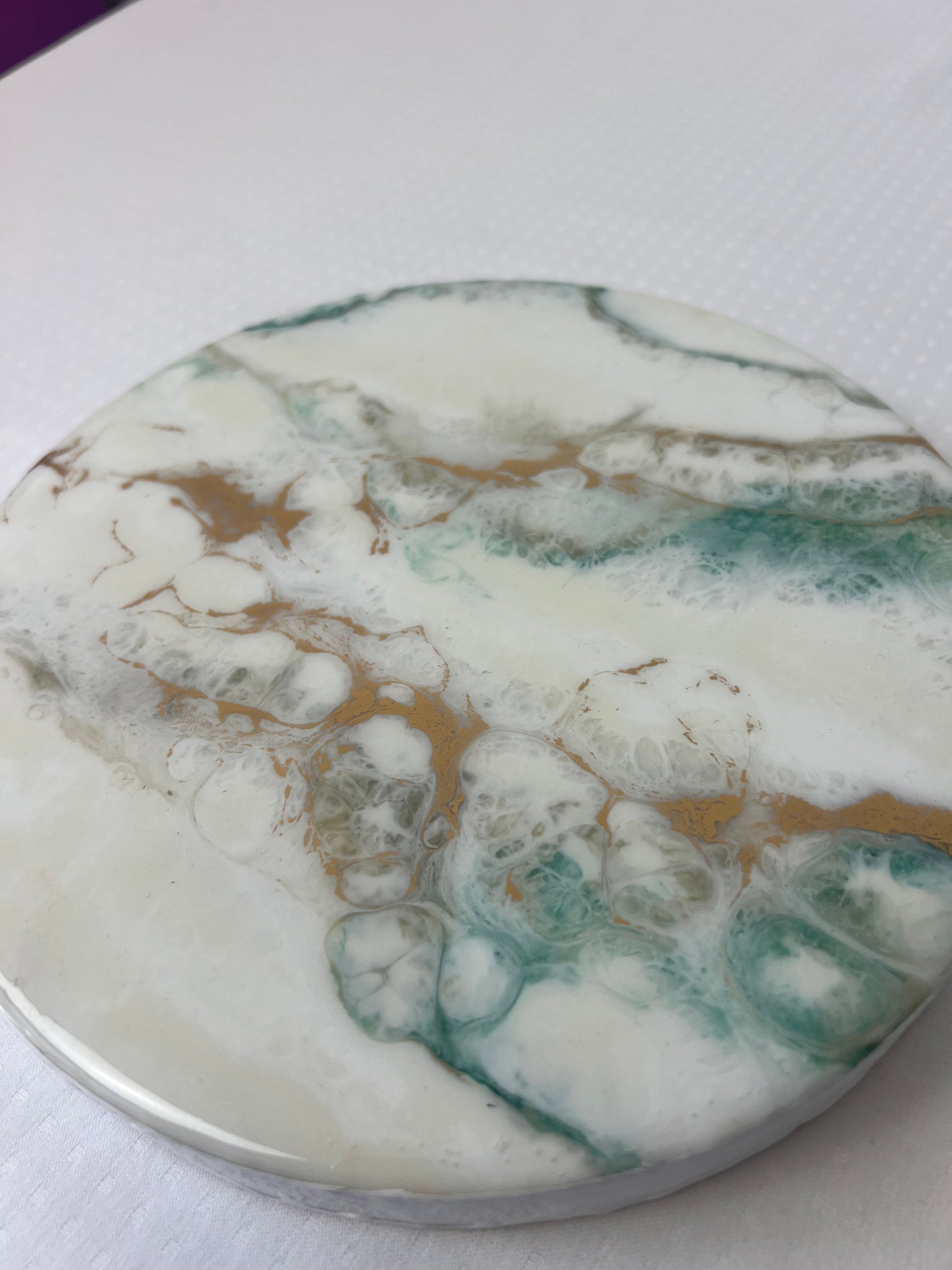 Tacka gipsowa ozdobiona techniką pouring art przy użyciu nietoksycznej żywicy epoksydowej. Wykonany przez Angelikę Lichotę z pracowni Ejko Art.