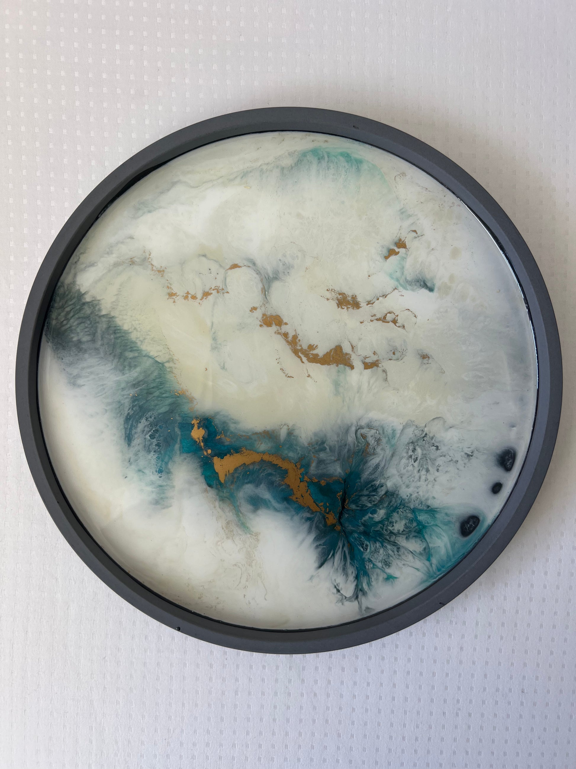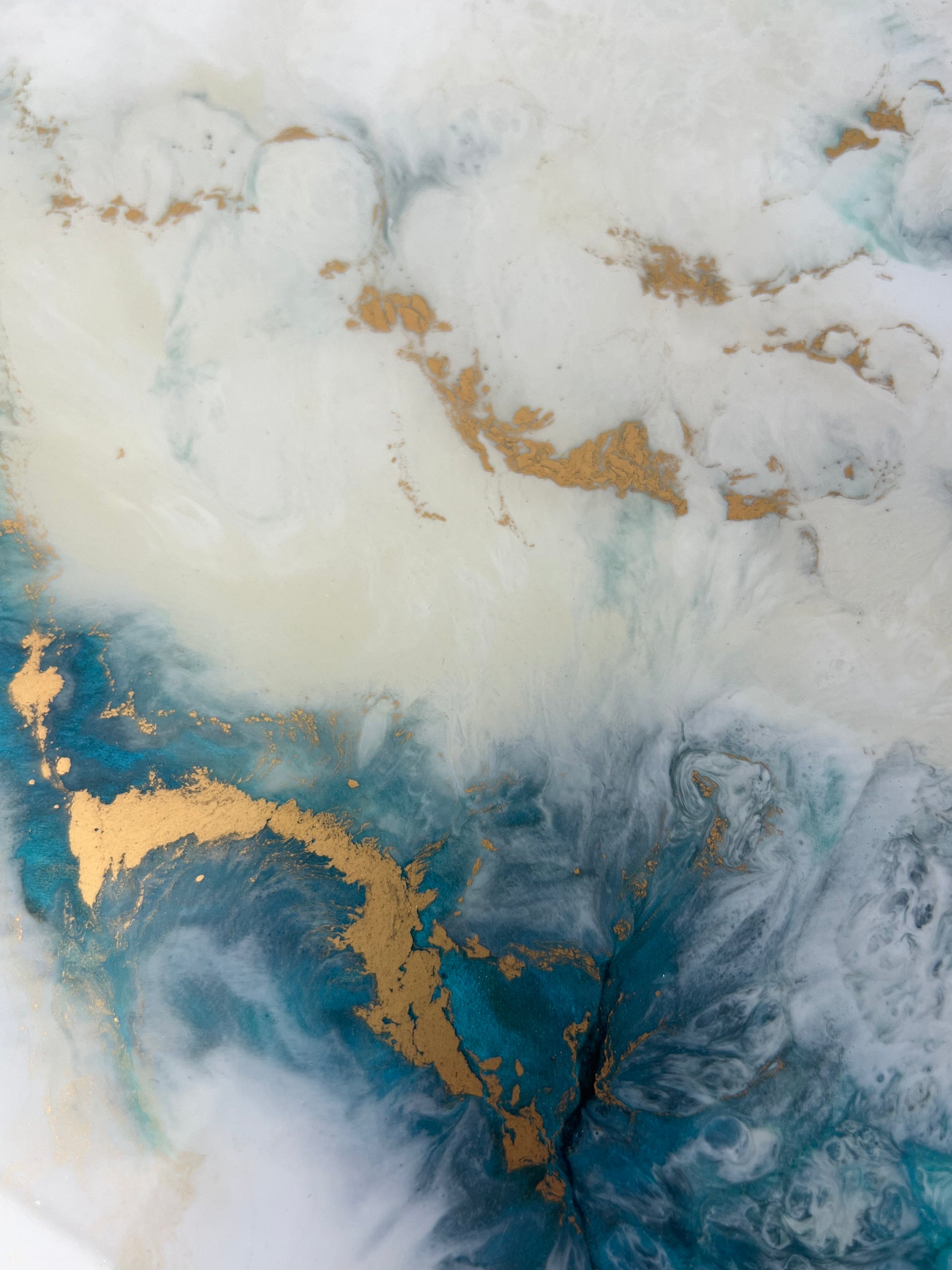 Tacka ozdobiona techniką pouring art przy użyciu nietoksycznej żywicy epoksydowej. Wykonany przez Angelikę Lichotę z pracowni Ejko Art.