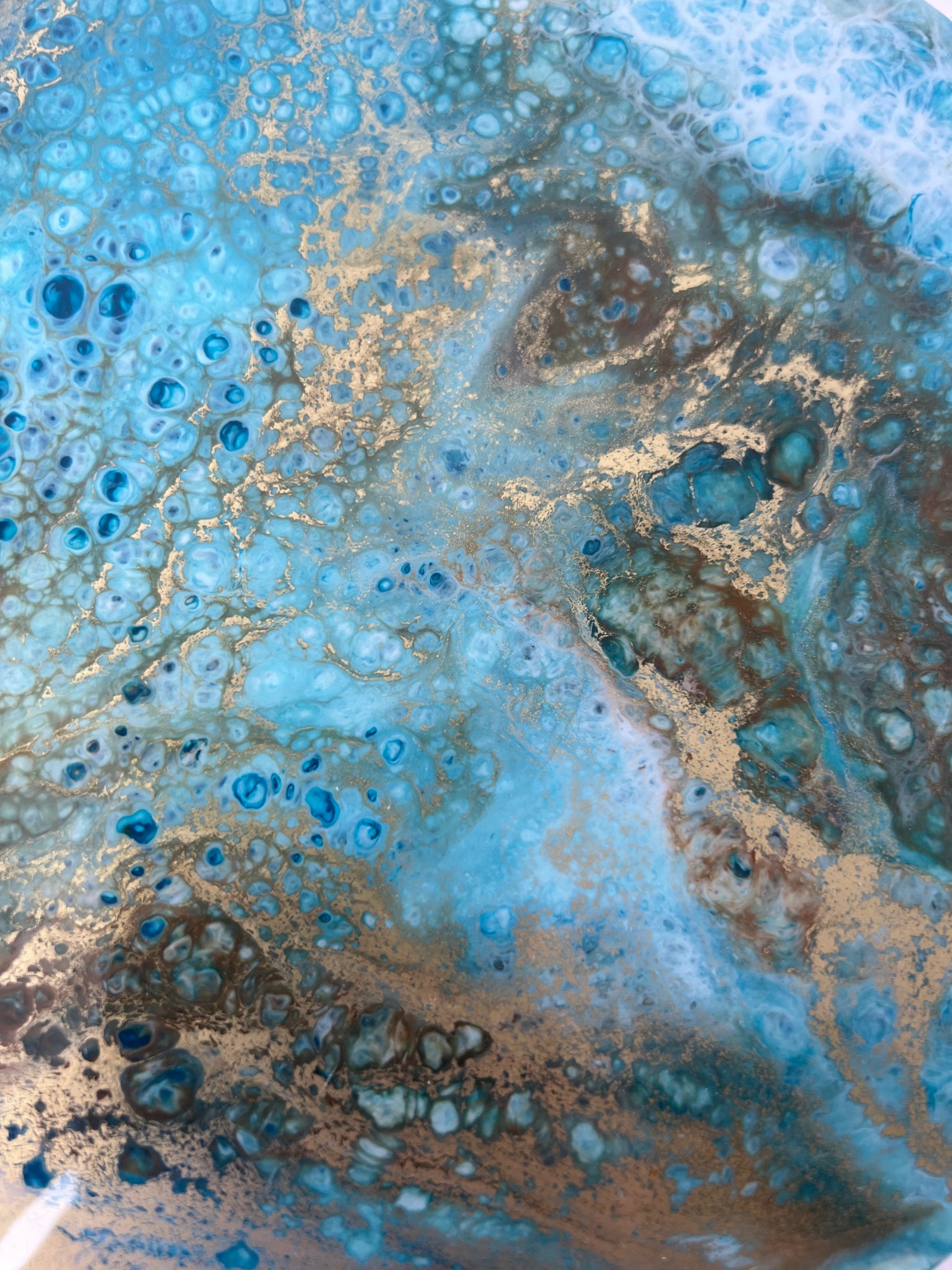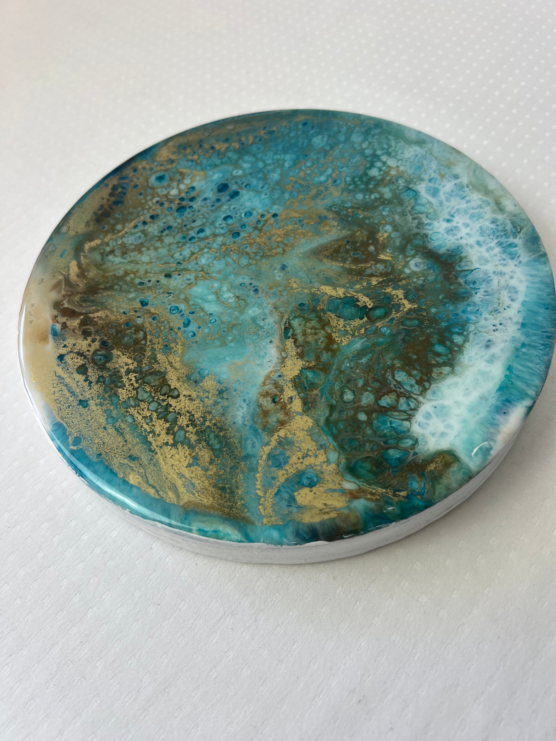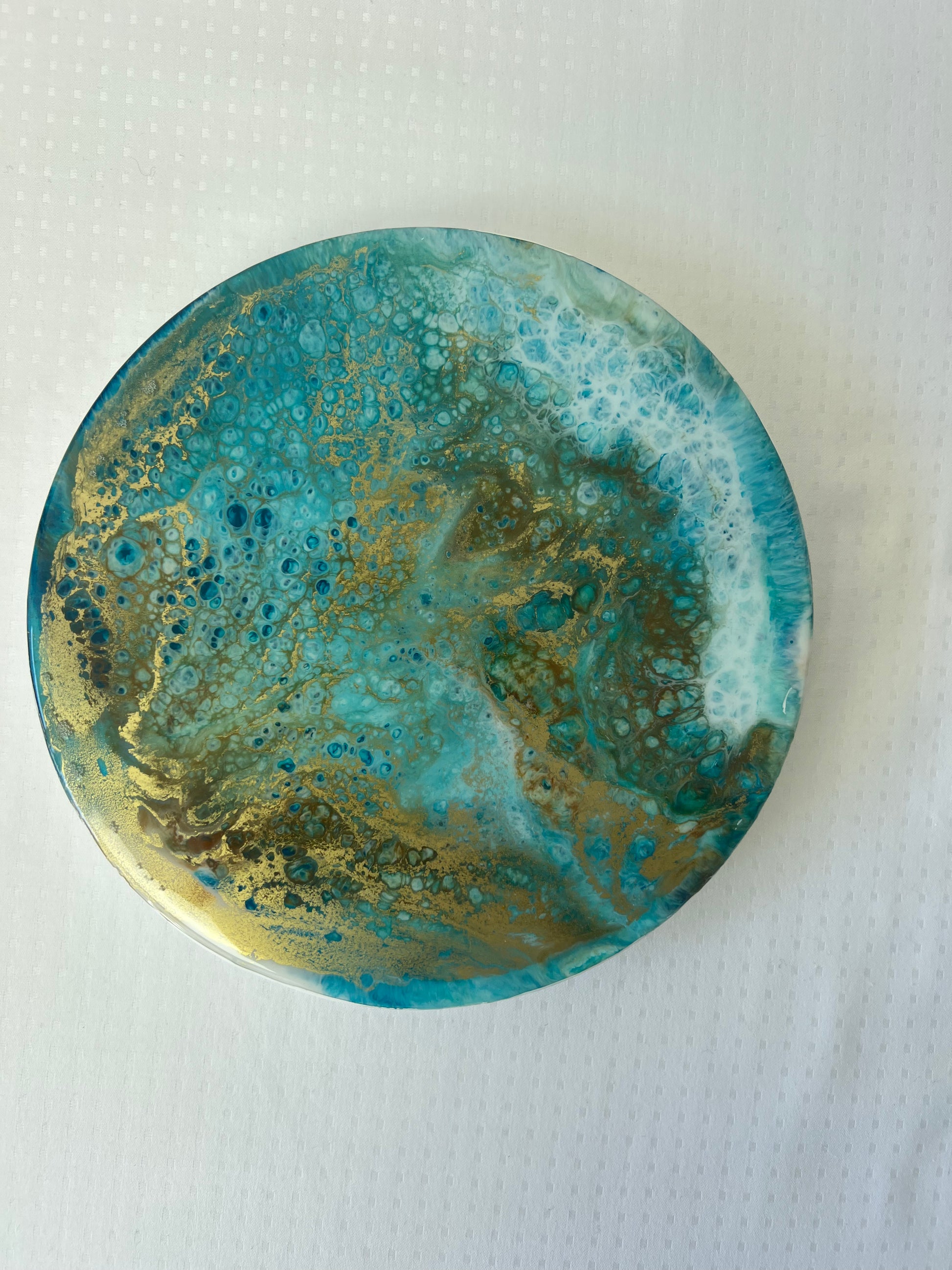 Tacka gipsowa ozdobiona techniką pouring art przy użyciu nietoksycznej żywicy epoksydowej. Wykonany przez Angelikę Lichotę z pracowni Ejko Art.