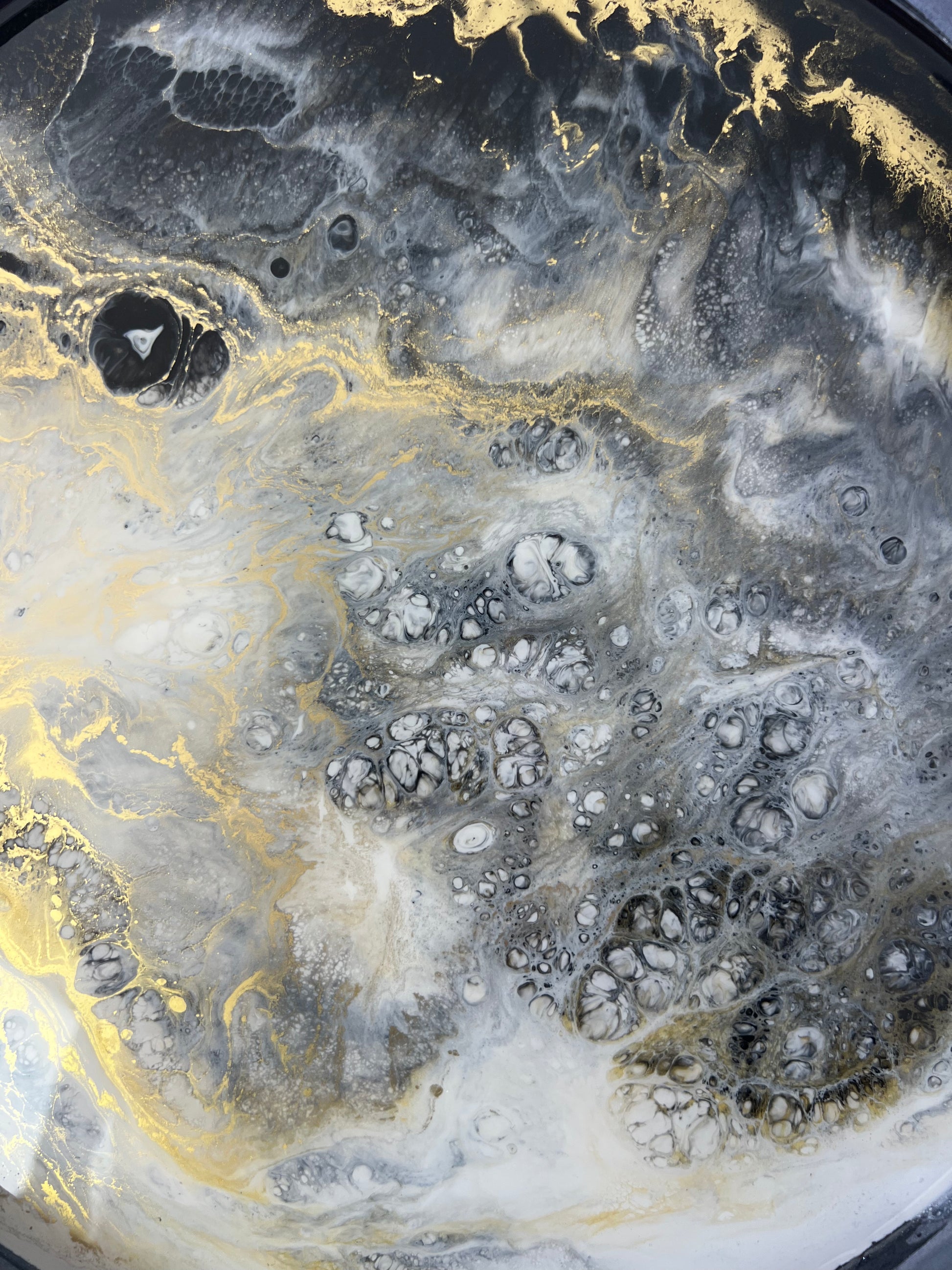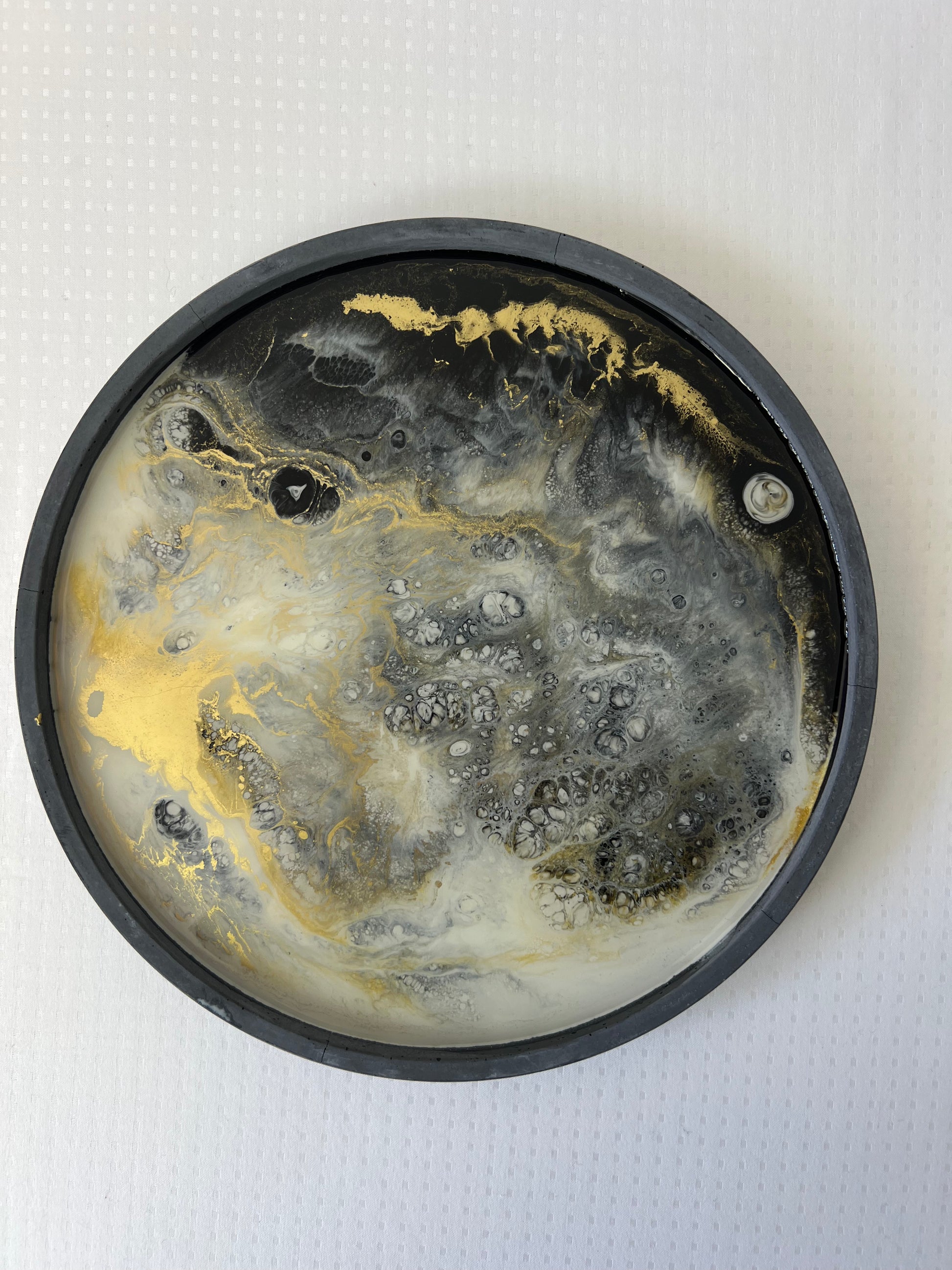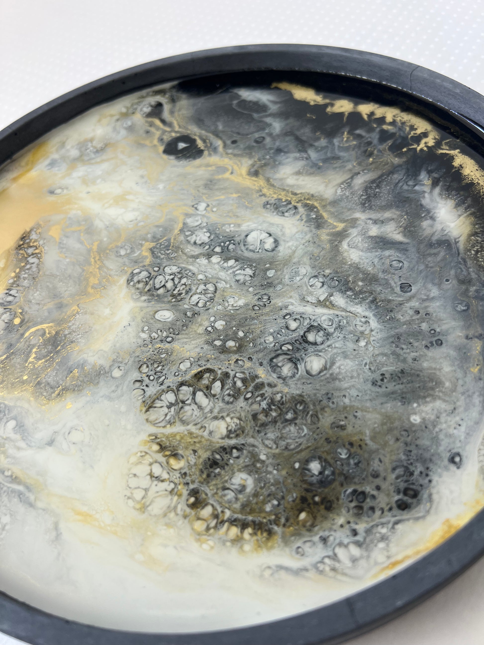 Tacka ozdobiona techniką pouring art przy użyciu nietoksycznej żywicy epoksydowej. Wykonany przez Angelikę Lichotę z pracowni Ejko Art.